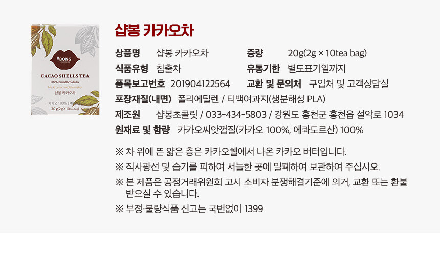 - 에콰도르 최상급 카카오원두를 초콜릿메이커가 직접 선별하고 로스팅하여 껍질을 벗겨 만든 프리미엄 카카오차